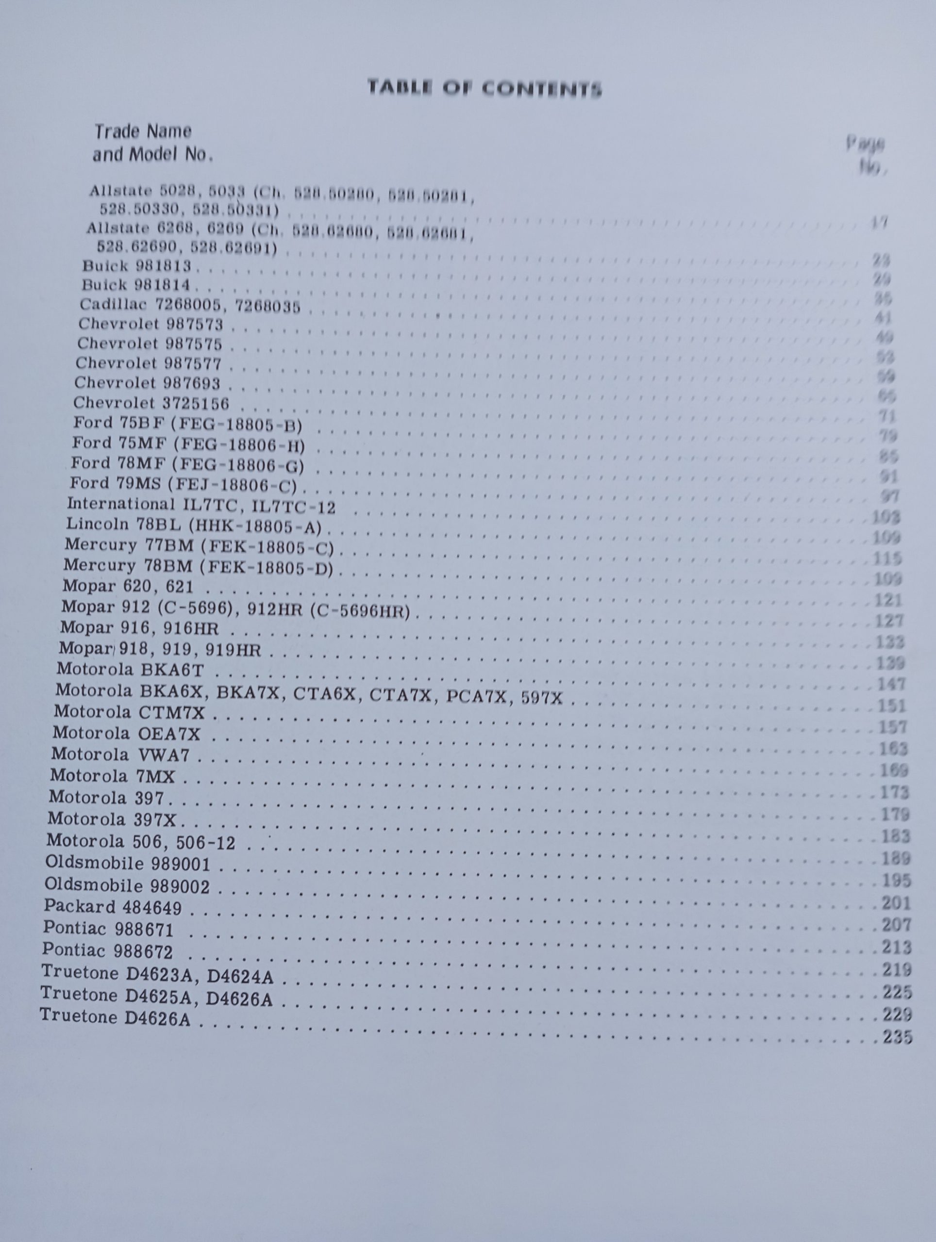 Aircastle, Airline, Allstate, Automatic, Buick, Cadillac, Chevrolet, Chrysler, Coronado, Delco, De Soto, Firestone, Ford, GMC, Hudson, Kaiser Lincoln, Mercury, Mopar, Motorola, Nash, oldsmobile, Packard, Philco, Plymouth, Pontiac, Regal, Silverstone, Studebaker, True Tone, Willys