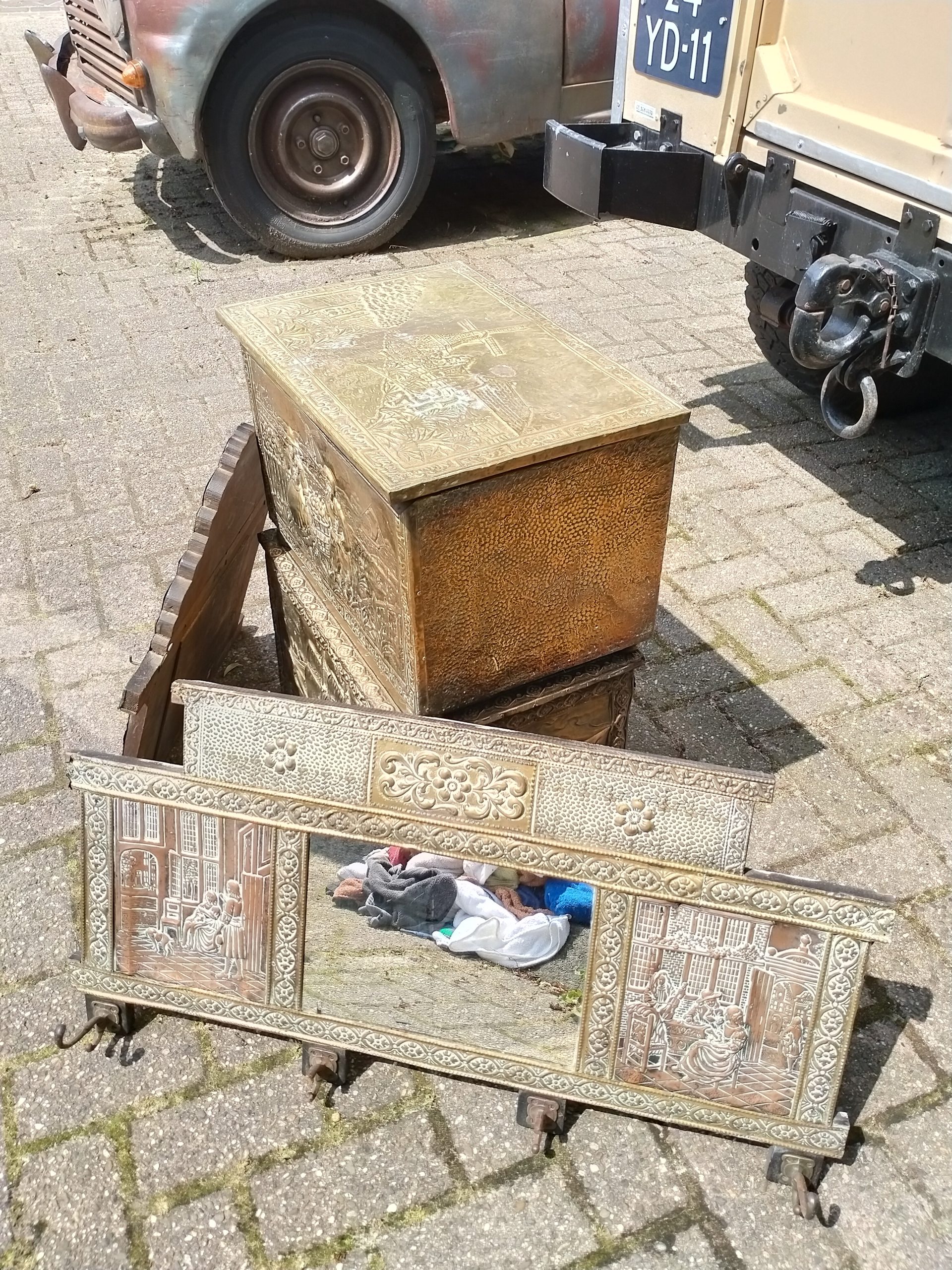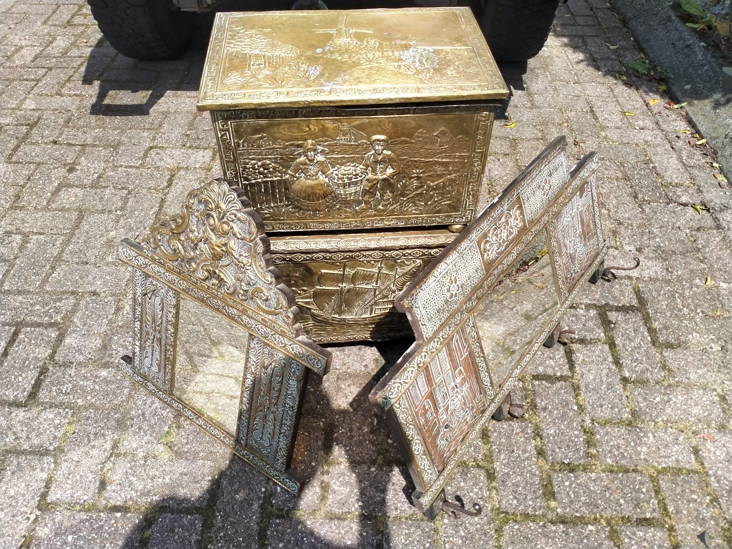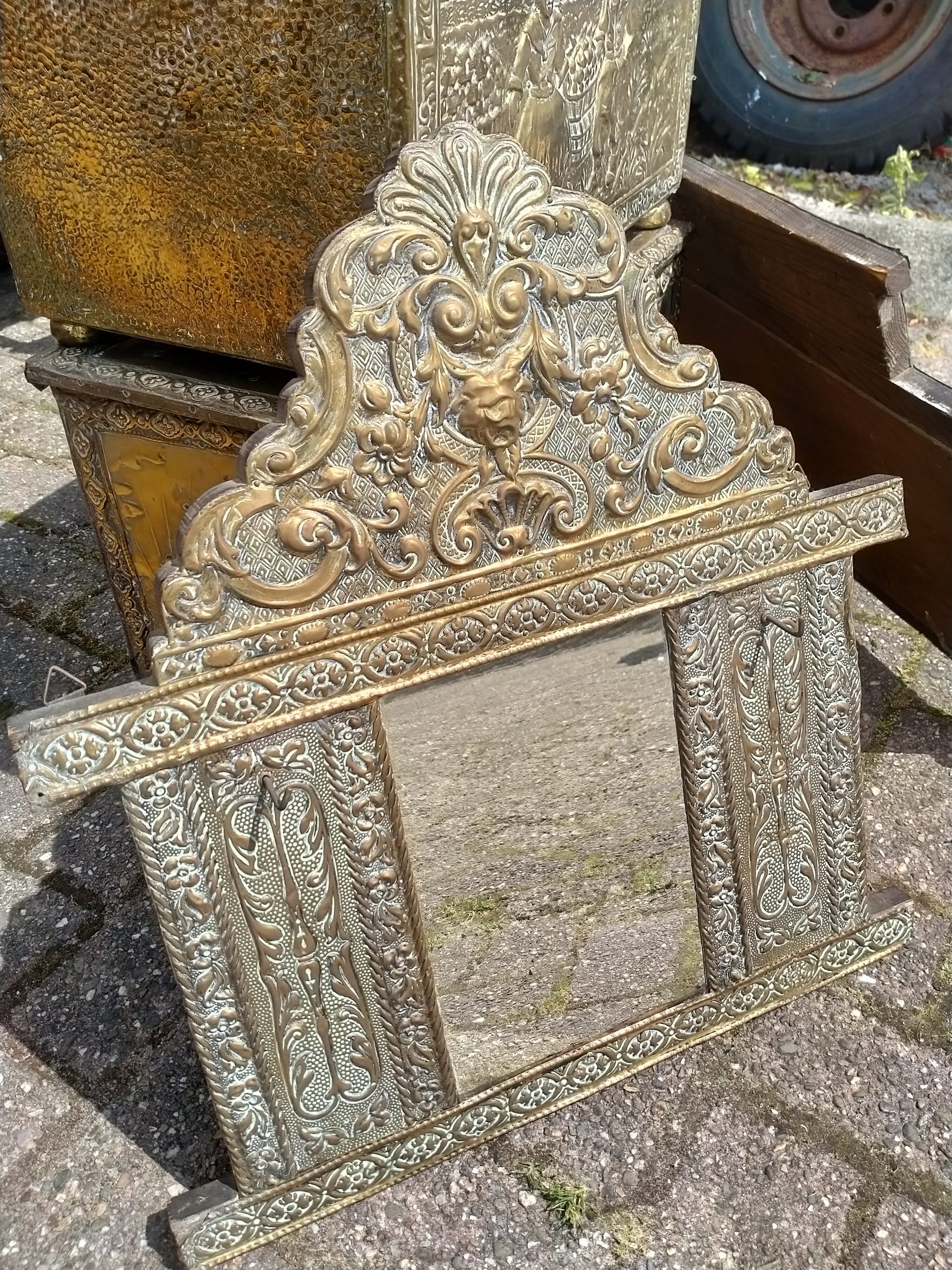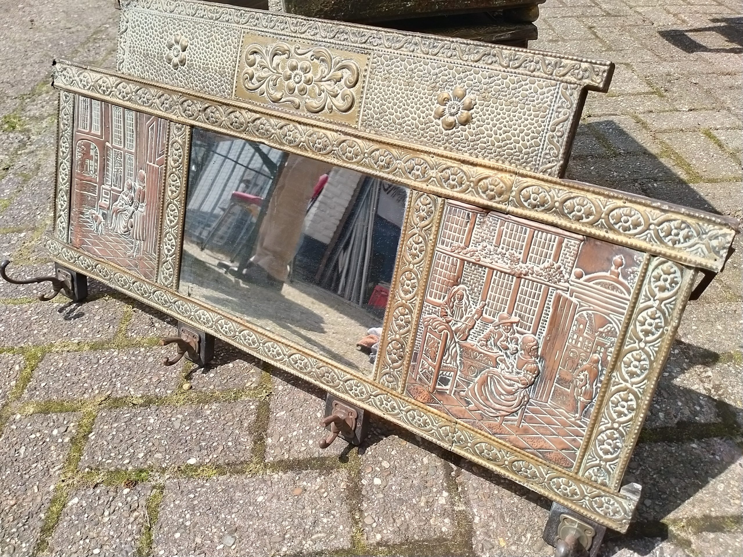 2 oude houten spiegels met koper beslagen