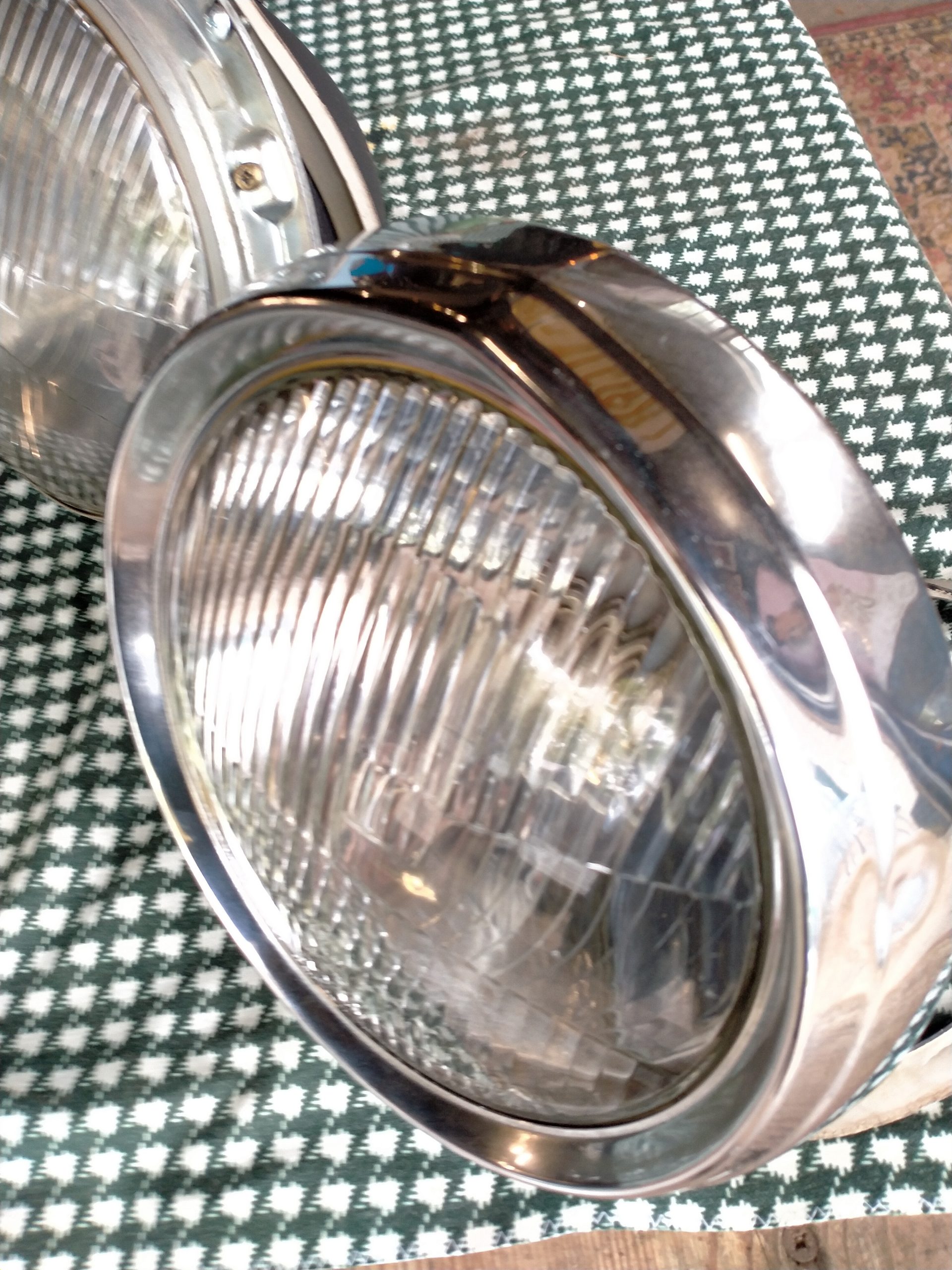 Bij 1 koplamp ontbreekt de chrome koplampring, verder geheel compleet.