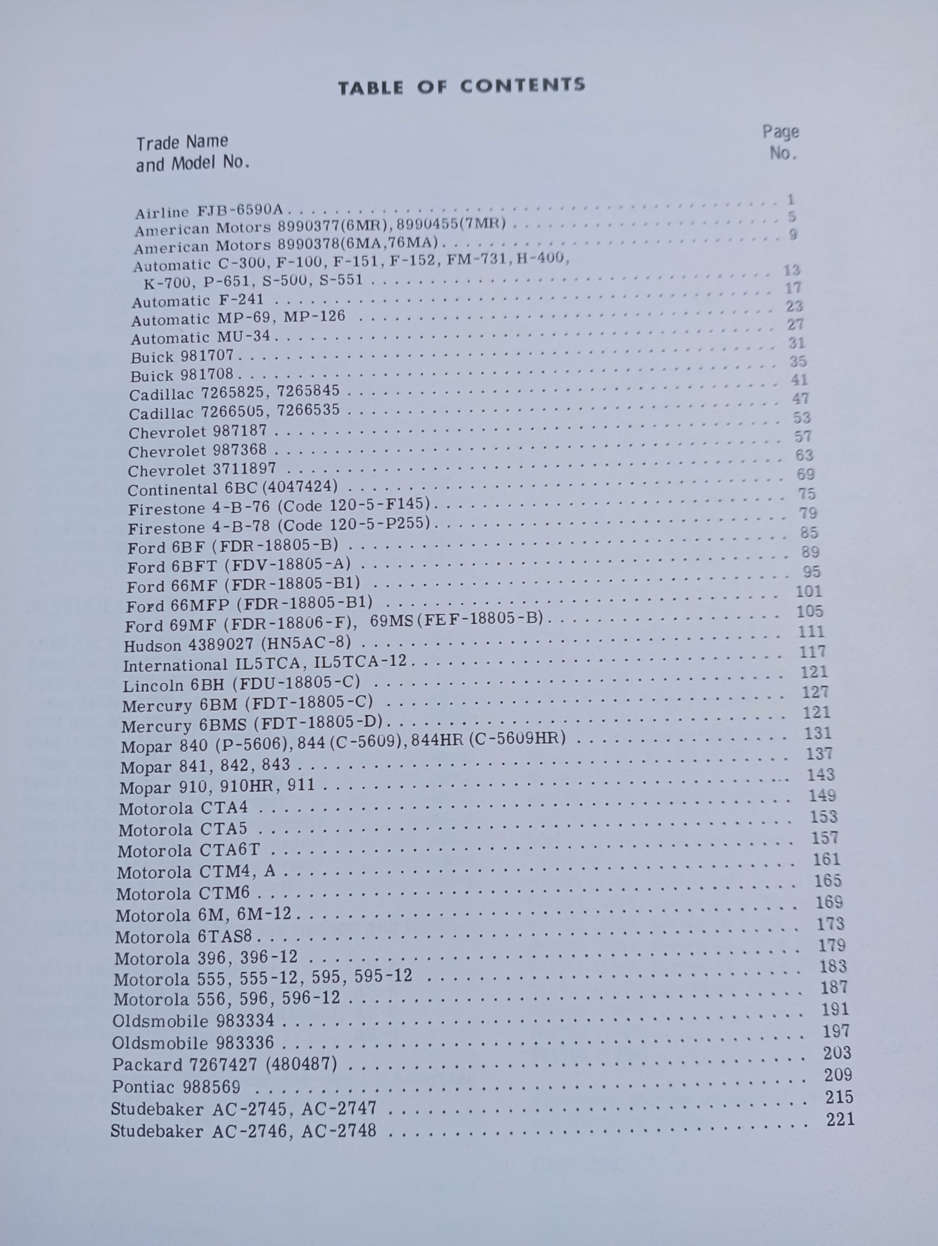Aircastle, Airline, Allstate, Automatic, Buick, Cadillac, Chevrolet, Chrysler, Coronado, Delco, De Soto, Firestone, Ford, GMC, Hudson, Kaiser Lincoln, Mercury, Mopar, Motorola, Nash, oldsmobile, Packard, Philco, Plymouth, Pontiac, Regal, Silverstone, Studebaker, True Tone, Willys