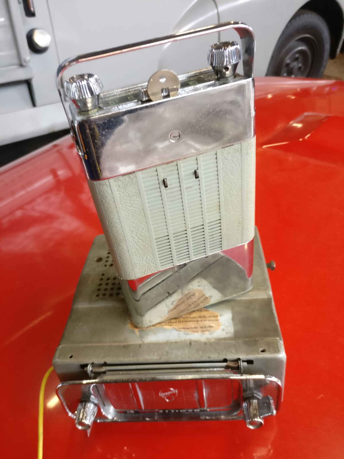 Uniek, kan gebruikt worden als autoradio en als draagbare radio, de eerste radio met slee!