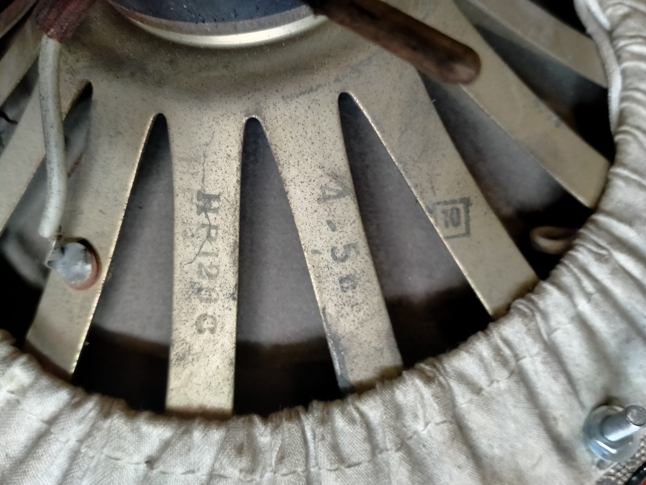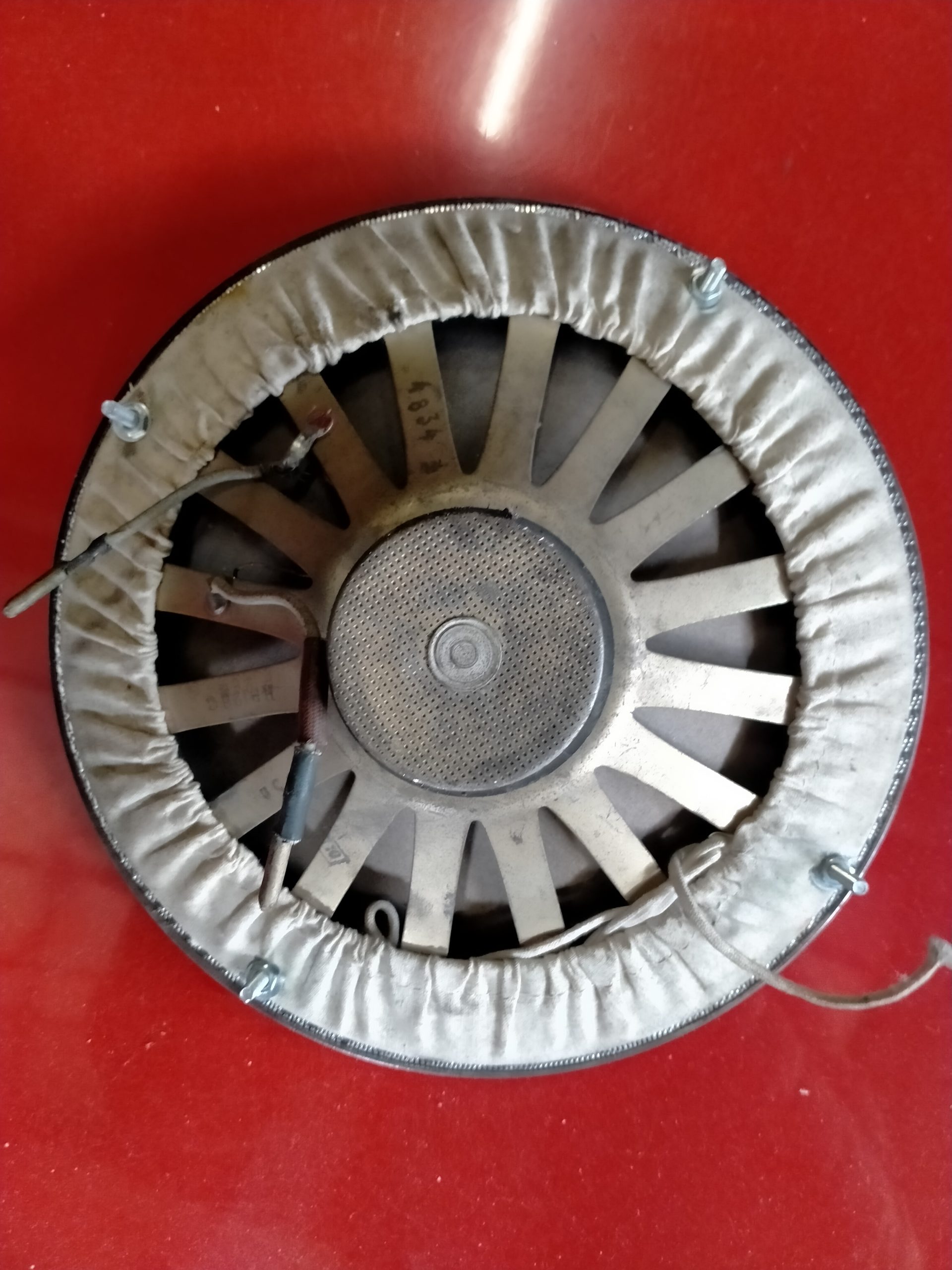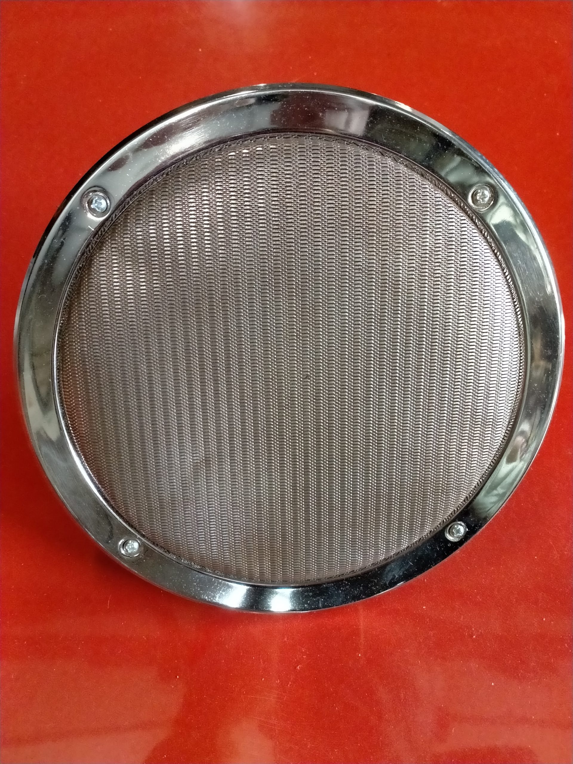 Net chroom met metalen speaker rooster, oude speaker met het originele doek en aansluitstekkers.