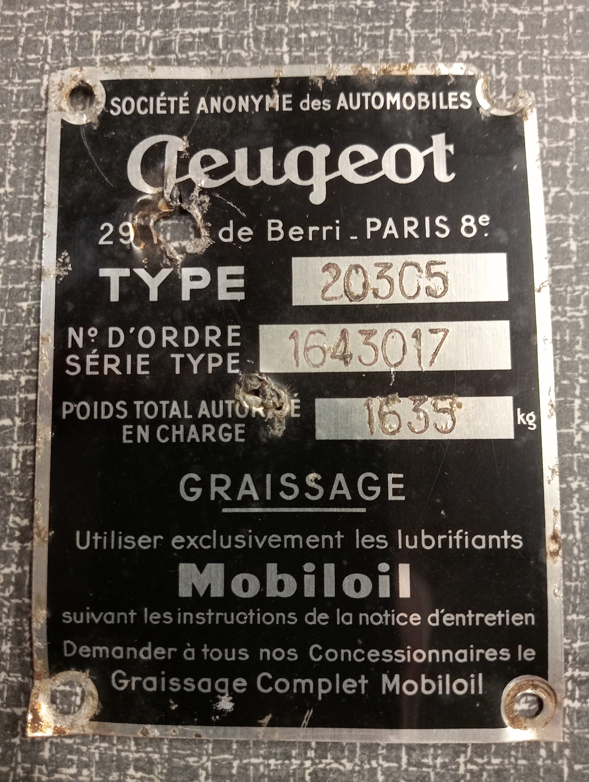 Typeplaatje Peugeot 203 C5 – Fourgonnette